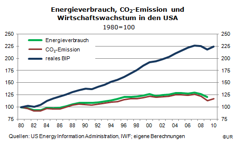 Die von der Logik der kapitalistischen Produktionsweise geforderte endlose Steigerung der Arbeitsproduktivität wurde seit der industriellen Revolution durch eine immer intensivere Nutzung von fossilen Energieträgern verwirklicht. Der Zusammenhang zwischen Wachstum und dem Ausstoß von Treibhausgasen wird im folgenden Diagramm deutlich. (Altvater 2005: 92)