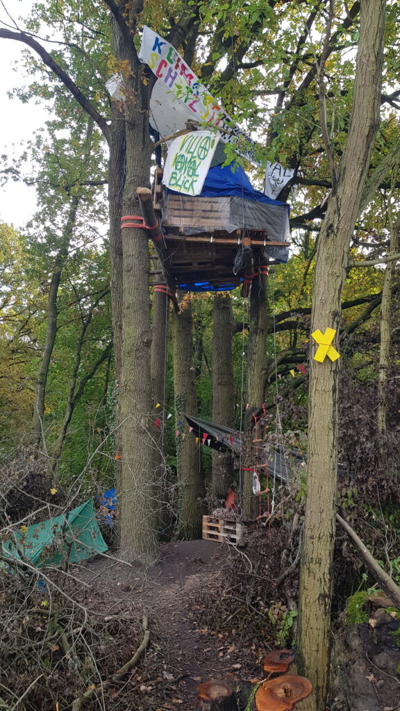 Solange unser Leben in den Bäumen hängt, werden sie nicht gefällt. Darum sind wir hier und darum bleiben wir, bis die Kanalverbreiterung endgültig gestoppt ist und die Bäume erhalten bleiben. Damit wir den Winter gut überstehen können haben wir ein Baumhaus in die Bäume gebaut und verharren jeden Tag dort. So konnten wir bereits seit unserer Ankuft Anfang Oktober verhindern, dass weitere Bäume gefällt werden.