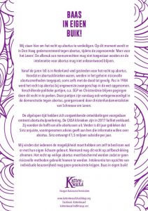 Wij zijn vóór het recht op abortus en vóór keuzevrijheid en autonomie! Abortusrecht is een mensenrecht. Iedereen moet de mogelijkheid hebben om zelf te beslissen over wat er met hun lichaam gebeurt en niemand mag ons dit recht op zelfbeschikking afnemen. Het recht op veilige abortus moet worden beschermd, zodat er geen risicovolle methoden gebruikt hoeven te worden. Intolerantie ten opzichte van individuele keuzevrijheid mag niet de ruimte krijgen om te groeien!