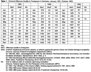 Abbildung 5: Criminal Offences Hostile to Foreigners in Germany. January 1991-October1993. (Ohlemacher 1994, S.227)