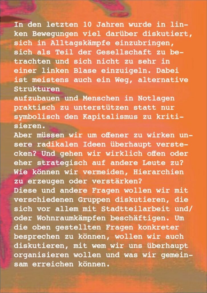 Wohnungsverlust und die Angst davor sind keine individuellen Schicksale, sondern betreffen Viele. Diese Entwicklung am Wohnungsmarkt orientiert sich fast ausschließlich an den Interessen von Wohnungsbesitzer_innen, Hausverwaltungen und Immobiliengesellschaften. Dem möchten wir unseren Widerstand entgegensetzen. Eine Möglichkeit kann sein, dass wir uns in selbstorganisierten, solidarischen Nachbarschaftsnetzwerken zusammenschließen. Über eine solidarische Vernetzung wollen wir uns gemeinsam mit anderen über die vielfältigen Konflikte in unserem Alltag als Mieter_innen austauschen und Lösungen erarbeiten.