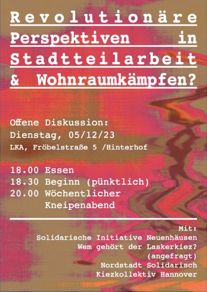 Le marché du logement et l‘offre d‘appartements à Hanovre évoluent de plus en plus. Dans de nombreux endroits de la ville, les locataires sont confrontés à des loyers en hausse, l’absence de réparation des maisons délabrés, à des stratégies de location agressives et à la conversion de location en condos. La perte de logement et la peur de celui-ci ne sont pas des destins individuels, ils touchent un grand nombre de personnes. Ce développement sur le marché du logement est presque exclusivement axé sur les intérêts des propriétaires, des gestionnaires immobiliers et des sociétés immobilières. Nous voulons montrer notre résistance à ce-la. Une possibilité pourrait consister à nous unir dans des réseaux de voisinage auto-organisés et solidaires. À travers un réseau de solidarité, nous souhaitons partager des idées avec d‘autres sur les divers conflits de nos vies quotidiennes en tant que locataires et développer des solutions.