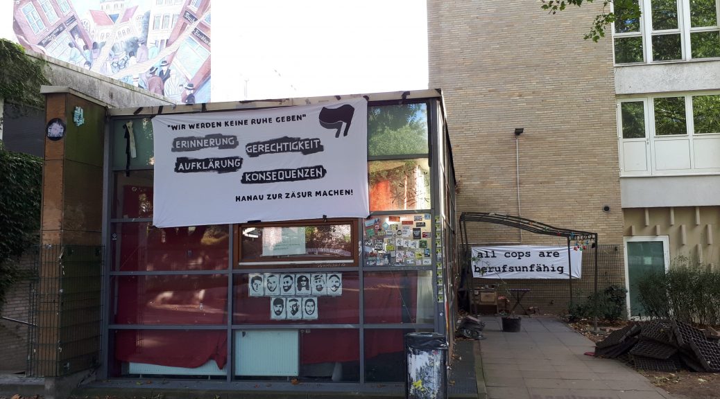Auf dem entwendeten Transparent befand sich auch noch ein Hinweis auf die Gedenkdemonstration für die Opfer in Hanau, die eigentlich am vergangenen Mittwoch in Hamburg veranstaltet werden. Sechs Monate nach den rassistischen Anschlägen in Hanau, sollte mit der Demonstration “Erinnerung – Gerechtigkeit – Aufklärung – Konsequenzen!” ein würdiges Gedenken an die Opfer stattfinden. Dies wurde jedoch durch die Polizei Hamburg verhindert². Newroz Duman von der Initiative 19. Februar sagt dazu: “Mit Bestürzung haben wir das Vorgehen der Hamburger Polizei beobachtet, die 1000 Menschen daran hinderte, würdevoll an die Hanauer Ermordeten zu gedenken. Erneut wendet sich die Polizei gegen die Falschen. Auch hier in Hanau wissen wir von den Angehörigen, dass die Polizei – vor allem in Kesselstadt – seit Jahren lieber ihre Kinder und Freunde schikaniert, statt Nazis die Waffen wegzunehmen und für die Sicherheit für jeden zu sorgen.”