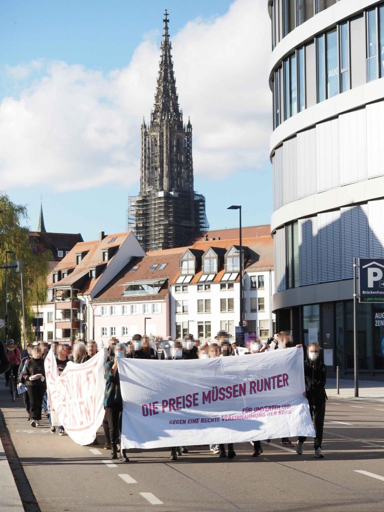 „Mit 50-80 Leuten haben wir heute linke Perspektiven zu den Preissteigerungen auf die Straße getragen und gleichzeitig der rechten Vereinnahmung durch eine Querdenken Kundgebung widersprochen. Klein aber fein ist unser Fazit – laut und mit viel Zustimmung sind wir durch die Ulmer Innenstadt gezogen. In den Redebeiträgen haben wir soziale und öklogische Antworten beleuchtet – Danke an alle die mit auf die Straße gekommen sind. PS: Die Querdenken Veranstaltung hatte 1000 Leute erwartet, tatsächlich waren es keine 100.“
