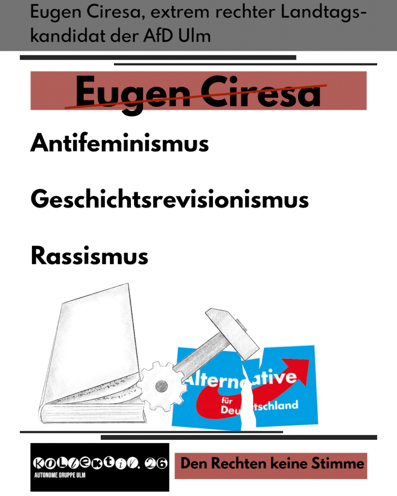 Dieses Jahr tritt zur Landtagswahl Eugen Ciresa in den Wahlkreisen Ulm und Ehingen erneut als Landtagskandidat für die AfD an. Bereits bei der letzten Landtagswahl 2016 und bei der Bundestagswahl 2017 war er in Ulm für die AfD aufgestellt. Eugen Ciresa trat 2013 in die AfD ein und ist extrem rechts.¹⁰