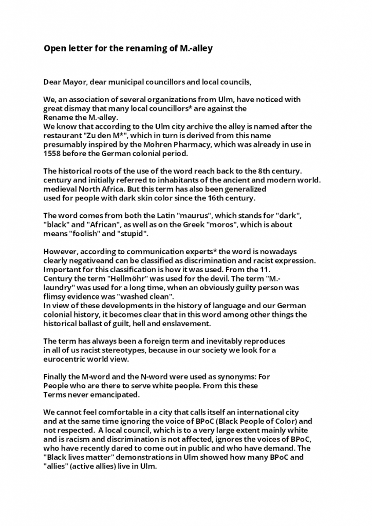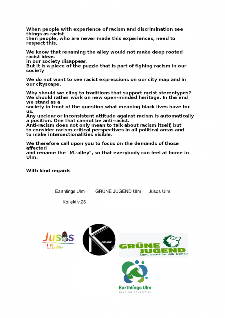 Today an open letter was published, which was initiated by the Green Youth Ulm/Neu-Ulm. They call for a renaming of the M.-Gasse in Ulm. We have co-signed it.