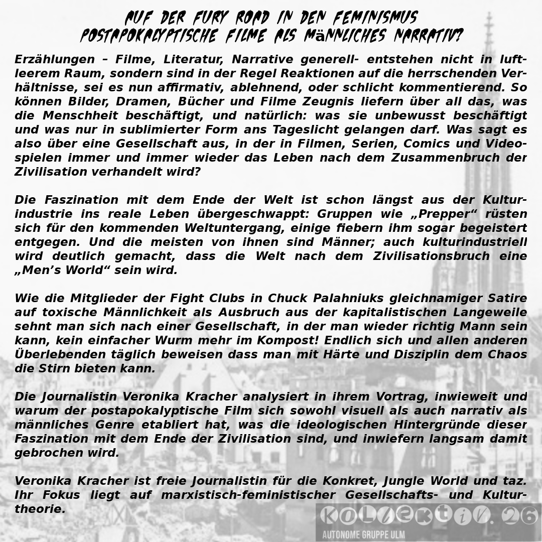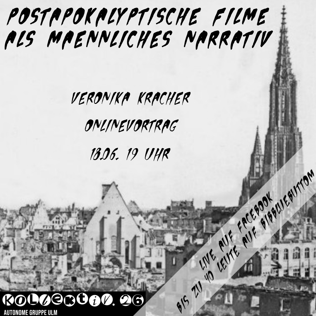 Veronika Kracher: Online/Live über BigBlueButtom (bis zu 40 Leute, nach Möglichkeit deswegen bitte Facebook nutzen) und Facebook: https://www.facebook.com/kollektiv.26/live/