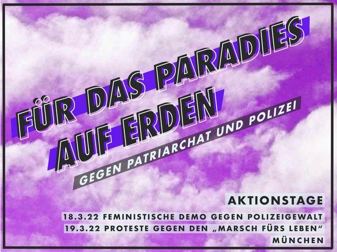 Am 19. März 2022 findet in München der zweite „Marsch fürs Leben“ statt, eine Demonstration radikaler Abtreibungsgegner*innen. Wie bereits im vergangenen Jahrwollen wir diese antifeministischen Umtriebe nicht unbeantwortet lassen und rufen unter dem Motto „Für das Paradies auf Erden“ dazu auf, ein Wochenende lang gemeinsam für eine Welt ohne Bullen, ohne Fundis und ohne Patriarchat auf die Straße zu gehen.