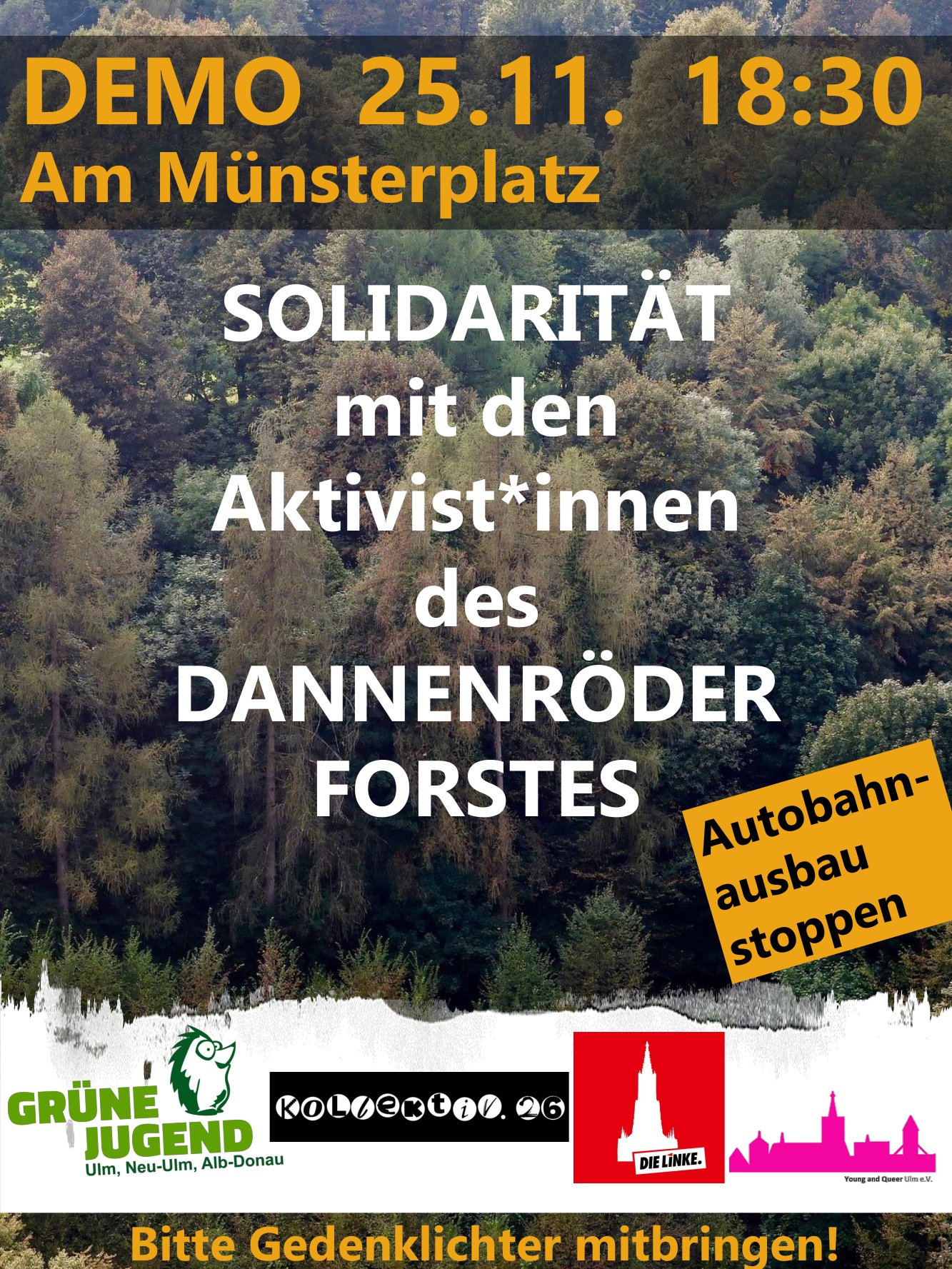 Am Mittwoch gibt es in Ulm eine Soli Kundgebung für die Aktivist*innen im Danneröder Forst. Eine von uns war vor Ort und wird über ihre Erfahrungen dort reden.