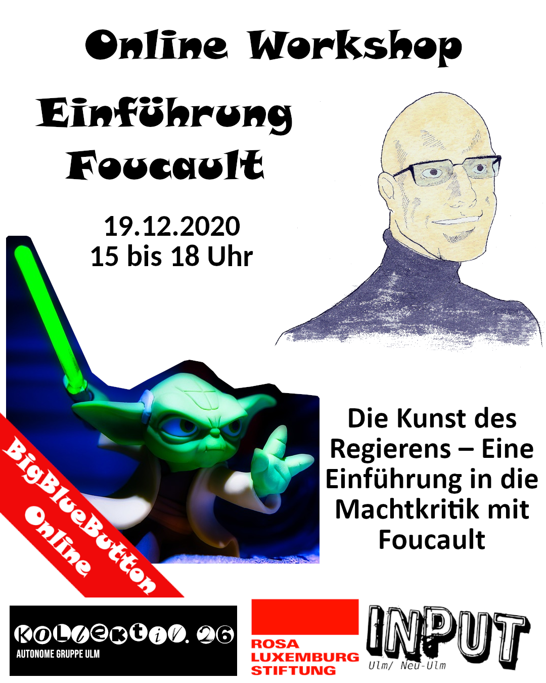 Der Workshop versucht, mit Hilfe des Originaltextes diese Machtanalyse von Foucault zu umreißen. Ausgehend von der Entwicklung der Disziplinargesellschaft, in der kontinuierlich überwacht und bestraft wird, betrachten wir Wissen, Macht und Institutionen, mit deren Hilfe die „Kunst des Regierens“ umgesetzt wird, eine Kunst welche den Erhalt des Kapitalismus (das Machtsystem der kapitalistischen Produktion) zum Ziel hat.