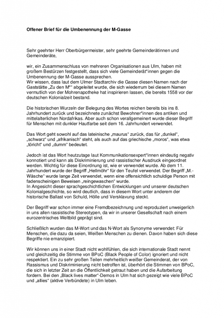 Die Grüne Jugend Ulm/Neu-Ulm hat einen Offenen Brief initiiert, in dem die Umbenennung der M.-Gasse in Ulm gefordert wird. Wir haben mit unterschrieben.