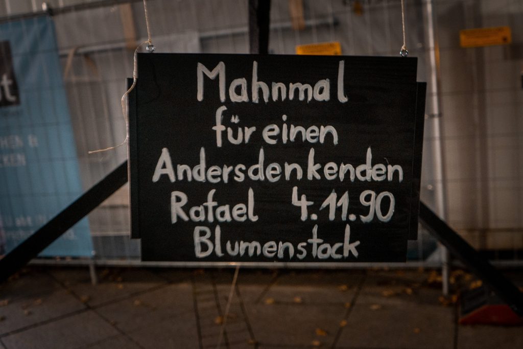 Die gestrige Veranstaltung in Gedenken an Rafael Blumenstock hat uns sehr berührt. Von den 70 Teilnehmer*innen brachten einige Blumen und Kerzen mit und es gab spontan zwei Beiträge von Zeitzeug*innen. Eine Zeitzeugin ergänzte uns gegenüber, dass Rafael Blumenstock ein außergewöhnlich begabter Musiker war und auf dem Klavier besonders gut improvisierte. Auch sei er ein sprachliches Talent gewesen.