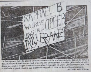am 4. November 1990 wurde Rafael Blumenstock auf dem Münsterplatz brutal ermordet. 2020 jährt sich die Tat zum 30. Mal. Bis heute konnten die Täter und ihre Motive nicht ermittelt werden. Doch gibt es deutliche Hinweise darauf, dass es sich um einen schwulenfeindlichen und rechten Mord handelt. Rafael Blumenstock wurde getötet, weil er anders war.