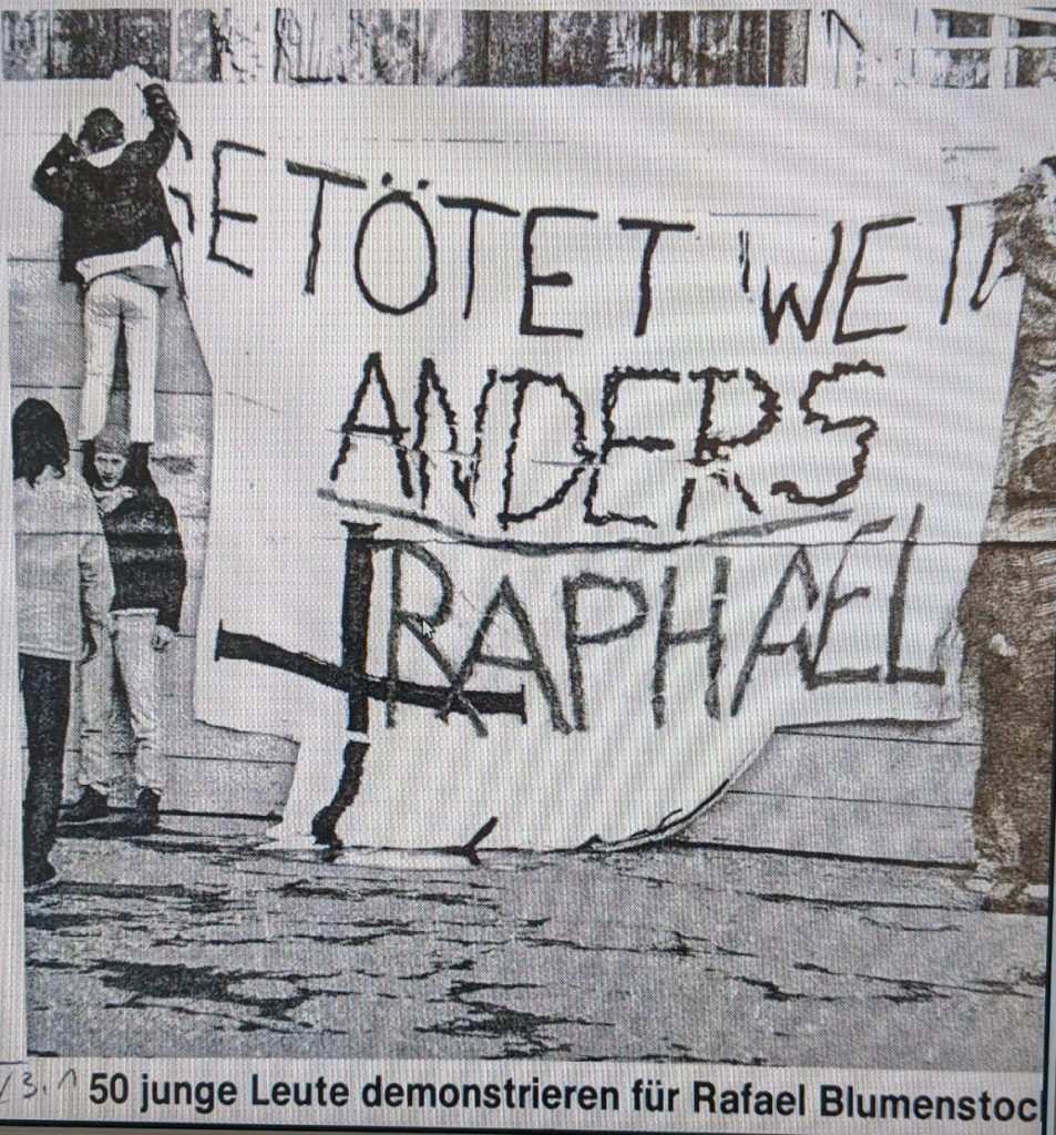 Deswegen fordern wir ein neues Mahnmal für Rafael Blumenstock, da das alte kaum sichtbar und beschädigt ist und es viel mehr für das Vergessen des Mordes als für die Erinnerung daran steht. Einen Vorschlag, wie das aussehen kann gab es bereits 1992 von verschiedenen Gruppen: Ein offener Kubus.