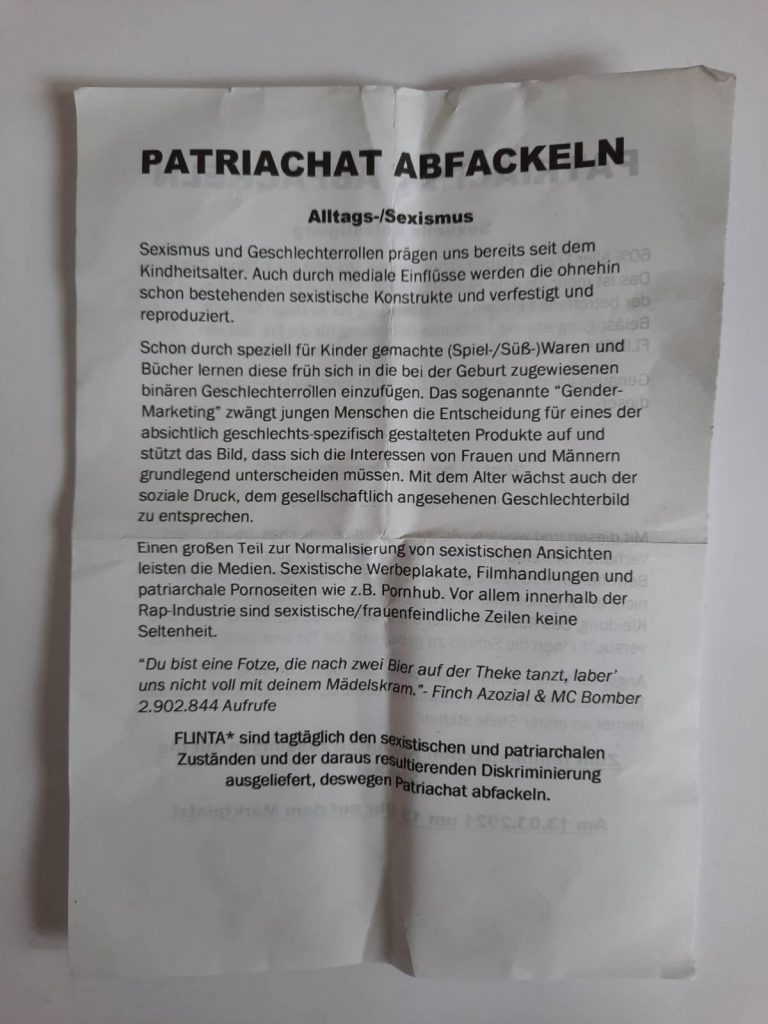 Dennoch ist das heute eine Rede und eine Veranstaltung, in der es nicht um cis Männer geht. Es geht um FLINTA* Personen und deren Kämpfe gegen mehrdimensionale Unterdrückungsmechanismen! Jeder Tag ist ein feministischer Kampftag!