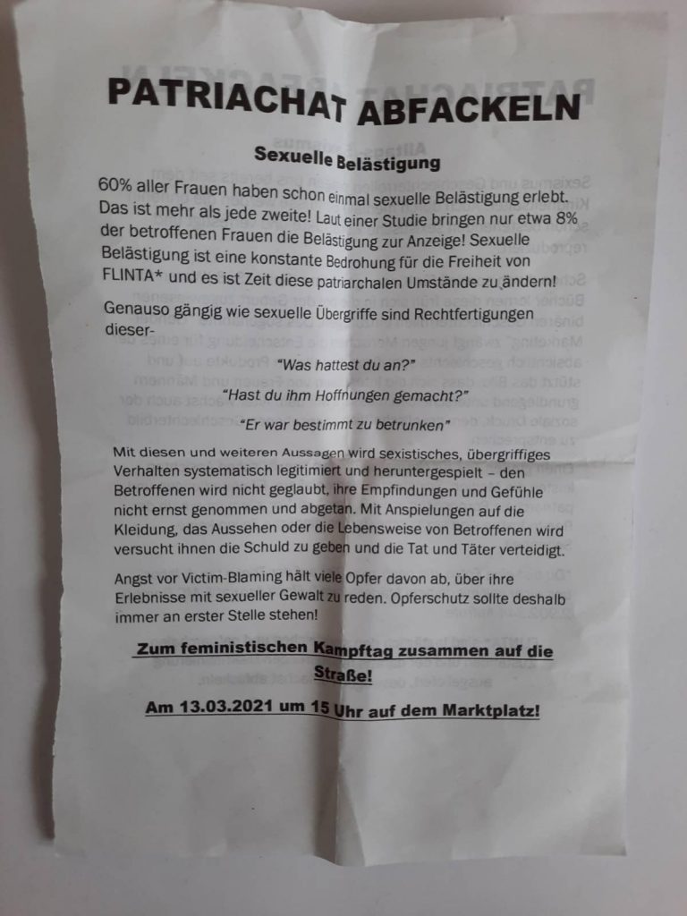 Zu Beginn möchte ich erstmal sehr positiv hervorheben, dass diese Veranstaltung hier nicht als Veranstaltung zum Weltfrauentag oder zum Frauen*tag oder zum Frauen*kampftag tituliert wurde, sondern als Veranstaltung zum feministischen Kampftag – und das ist auch richtig und wichtig so!