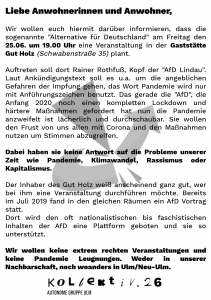 Gestern am 25.06.21 wollte die AfD Neu-Ulm ungestört in der Gaststätte Gut Holz in der Schwabenstraße 35 Neu-Ulm einen Vortrag von dem sehr wertgeschätzten Dr. Rainer Rothfuß abhalten. Dem wurde spontan & deutlich widersprochen, hier ein kurzer Bericht: