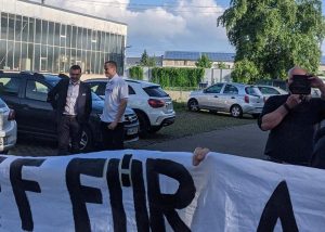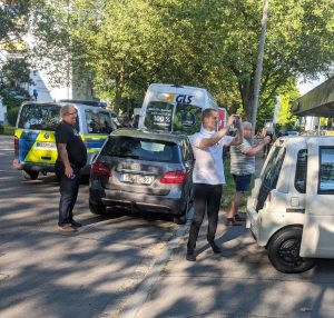- Zum einen zwei Vortragsbesuchende, die es für eine gute Idee hielten mit ihren Autos auf mehrere Menschen mit Banner auf dem Gehweg vor dem Gut Holz Parkplatz zuzufahren. Während einer recht schnell kapierte, dass es hier kein durchkommen geben würde, meinte ein anderer Kandidat mehrmals anzufahren bis sich direkt vor sein Auto gestellt wurde.