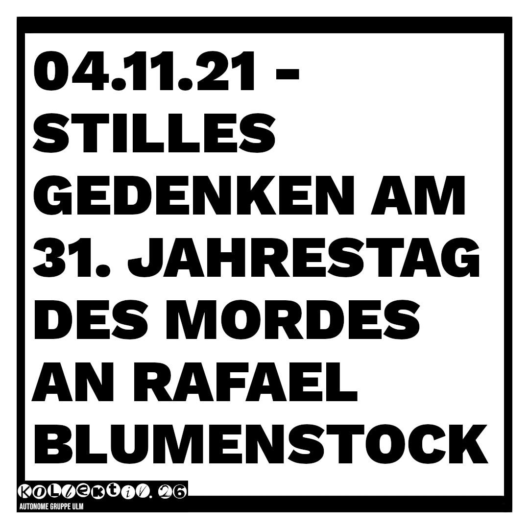 Kurze Klarstellung: Um 18.00 am 04.11.21 findet eine Kundgebung auf dem Münsterplatz zu den 10 Jahren Selbstenttarnung des NSU statt. Im Aufrufstext wird sich auch auf den Mord an Rafael Blumenstock bezogen. Die Gruppe die dazu aufruft nennt sich „Jugend Gegen Rassismus 731“ bestehend aus mehreren Gruppen.