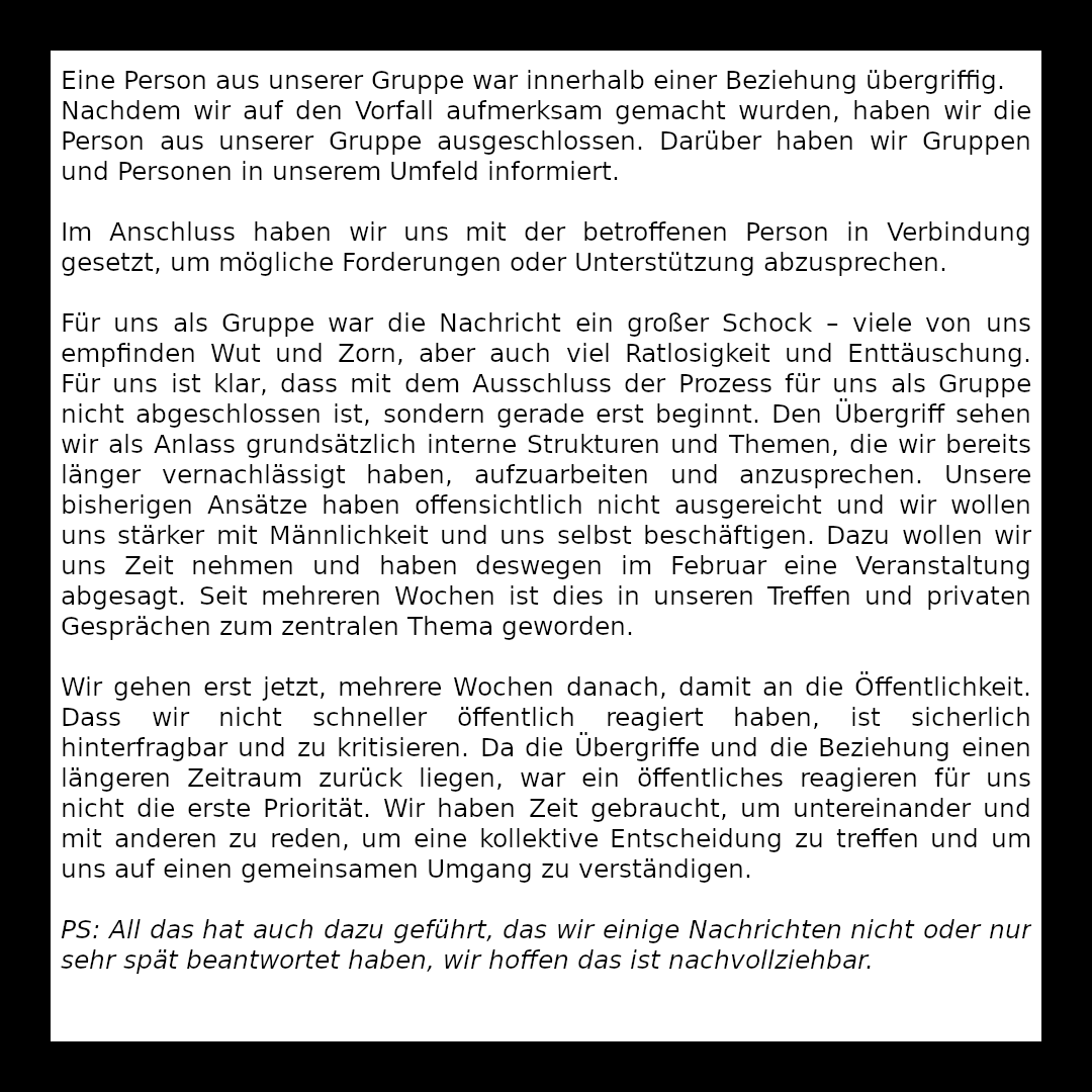 Hier ein kurzes Statment zu einem Übergriff und unserer internen Auseinandersetzung damit.