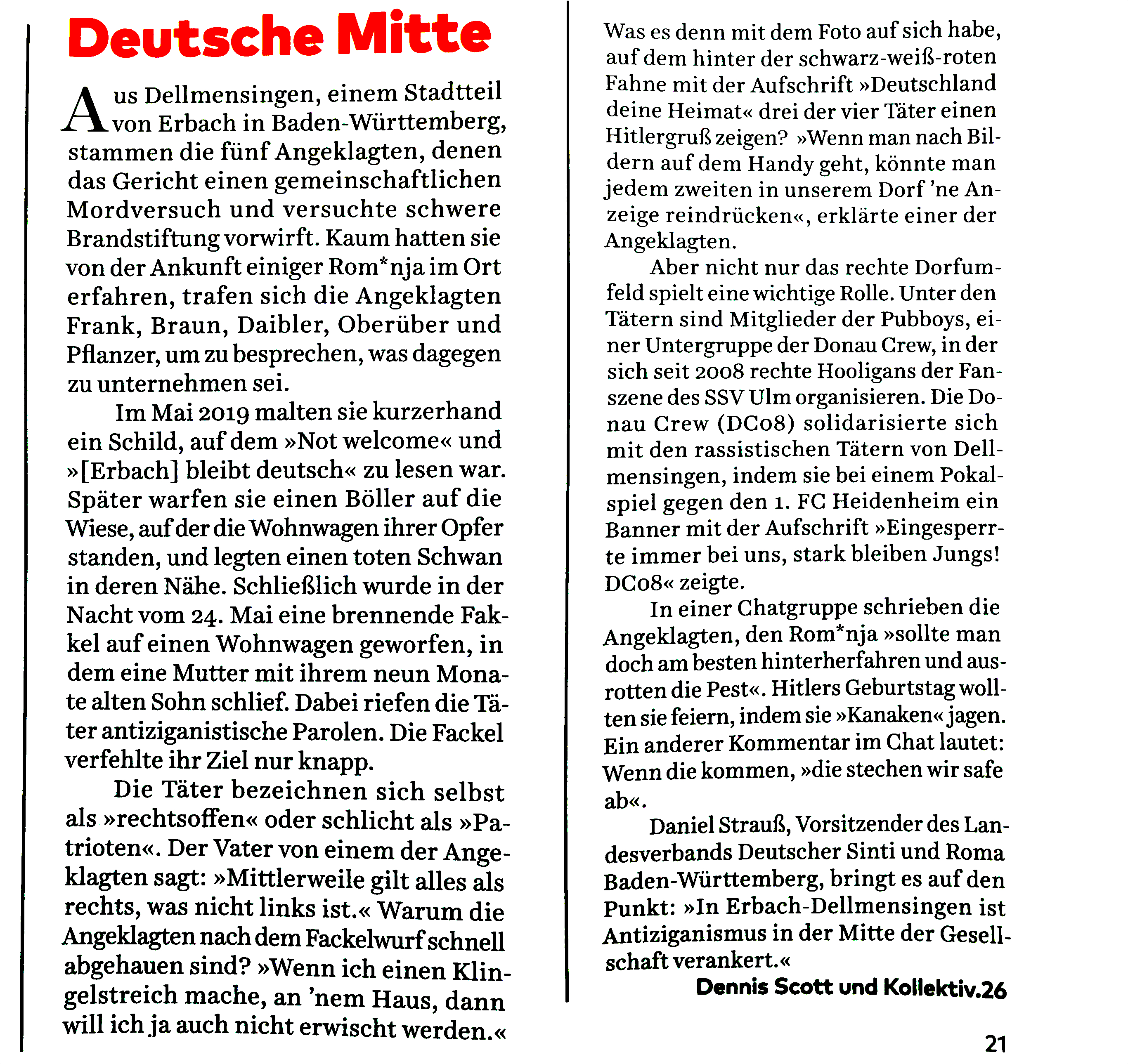 Seit mehreren Wochen läuft nun der Prozess gegen die 5 Nazis aus Dellmensingen, die angeklagt sind wegen einem antiziganistischem Mordversuch an einer Familie. Mittlerweile läuft das Verfahren nur noch in Bezug auf die Straftat „Nötigung“ und das Gericht prüft, ob das Verfahren ausgeweitet wird auf Nötigung gegen alle Personen, die auf dem angegriffenen Platz wohnten (über 30 Menschen). Der Mordversuch als solches kann vermutlich nicht mehr vor Gericht nachgewiesen werden, auch wenn dieser nahe liegt.