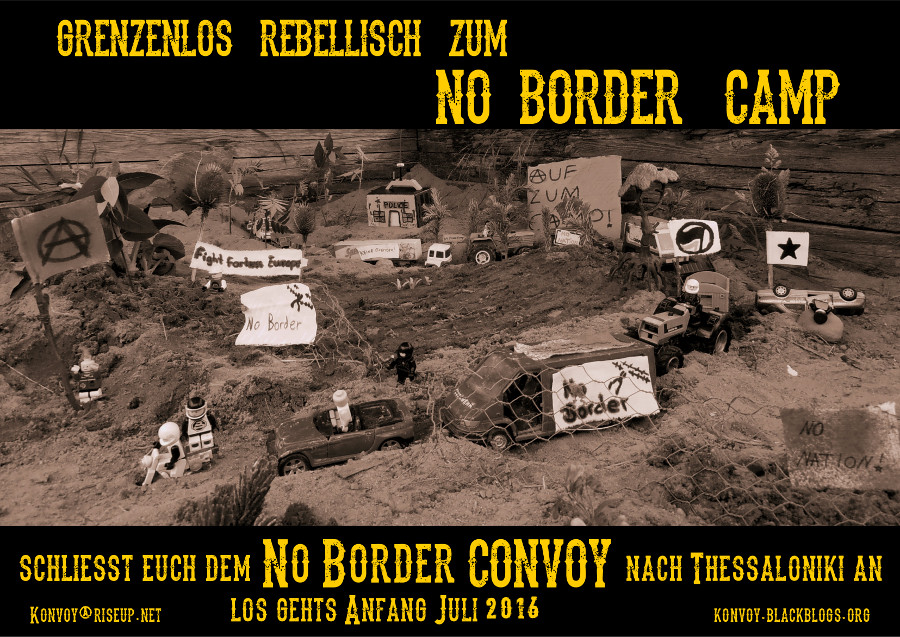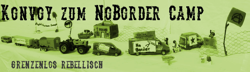 Wir werden trotzdem zum No-Border-Camp fahren und wünschen uns eine breite Beteiligung und ein kraftvolles Camp. Wir verweisen an dieser Stelle auf einen anderen Konvoy, der Anfang Juli in Deutschland zum No-Border-Camp aufbrechen wird. Weitere Infos dazu findet ihr auf www.alfpartout.blogsports.eu . Die im Entstehend begriffene Gruppe freut sich über Kontaktaufnahme.