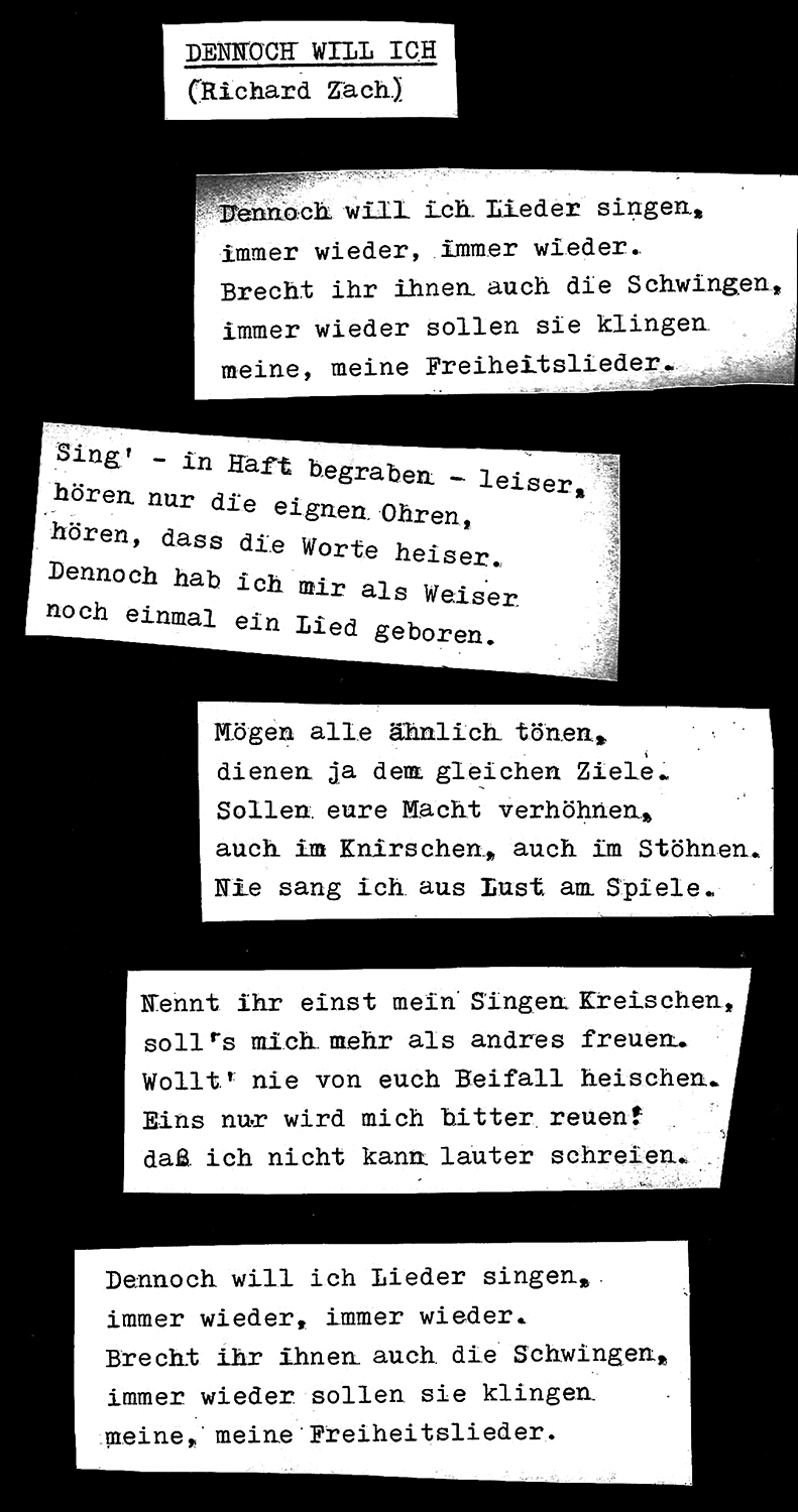 Während der anderthalbjährigen Haft in Graz und Berlin, sogar auf den Transporten zwischen Berlin, Graz und wieder Berlin hat Zach an die 800 Gedichte geschaffen. 200 davon wurden heimlich geschrieben, sie konnten in achtzig Kassibern nach draußen geschmuggelt werden: im Gummizug der Schmutzwäsche versteckt, dem Rechtsanwalt heimlich in die Hand gedrückt oder durch die Zellenwand gemorst und von einem Mitgefangenen aufgeschrieben.