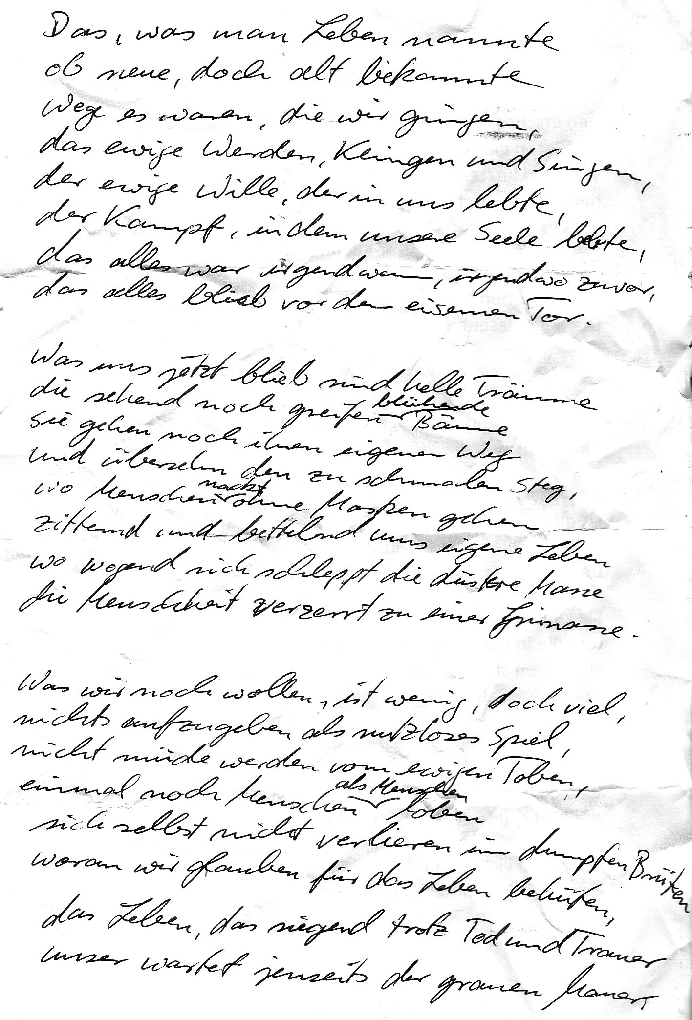 „Viele Gedichte habe ich mir in meiner Lagerzeit ausgedacht. Keine wertvollen Dichtungen, nur meine Gedanken über jeweils Erlebtes, in schlaflosen Nächten Zusammengereimtes. Sätze, die mich gegen die Grausamkeit, die um mich wütete, abschirmen sollten. Ich habe sie dann auf zerknüllte Papierfetzen, die der SS-Arzt in den Papierkorb warf, geschrieben und an einem versteckten Ort aufbewahrt. Alle diese Zettel gingen mir verloren, nur einige Gedichte habe ich im Gedächtnis behalten und sie nach unserer Befreiung aufgeschrieben – ohne zu wissen, ob sie jemals jemand lesen würde.“ (Antonia Bruha)