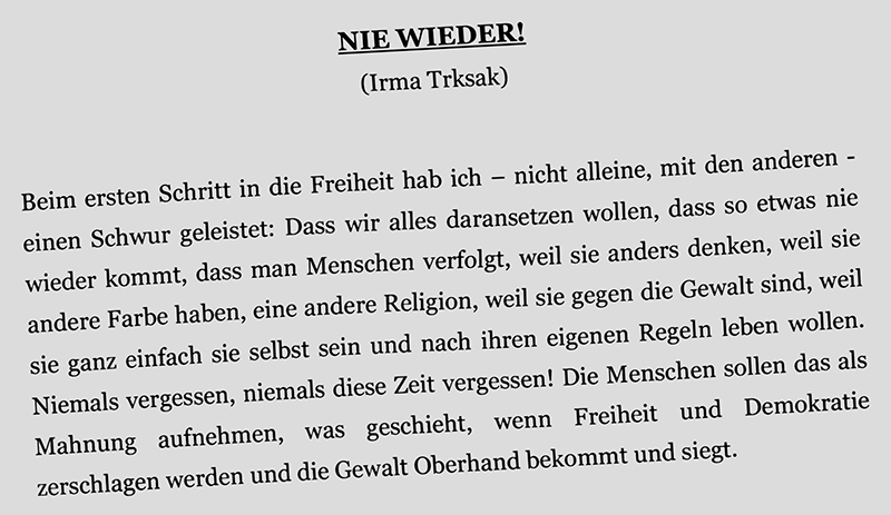 „Weißt du, wie wichtig Singen war? Nie hätt’ ich das missen wollen. Ich glaube nicht, dass ich sonst alles so überstanden hätte. Ich nicht. Und die anderen auch nicht. Das Ausdrücken deiner Gefühle war so eine Hilfe. Du legst ja Trauer, Schmerz oder Liebe in das, was du liest oder singst. Mit anderen zu singen war wie etwas Schönes schaffen. So ein Tupferl Glück im großen Meer des Grausamen.“ (Irma Trksak, 2007)
