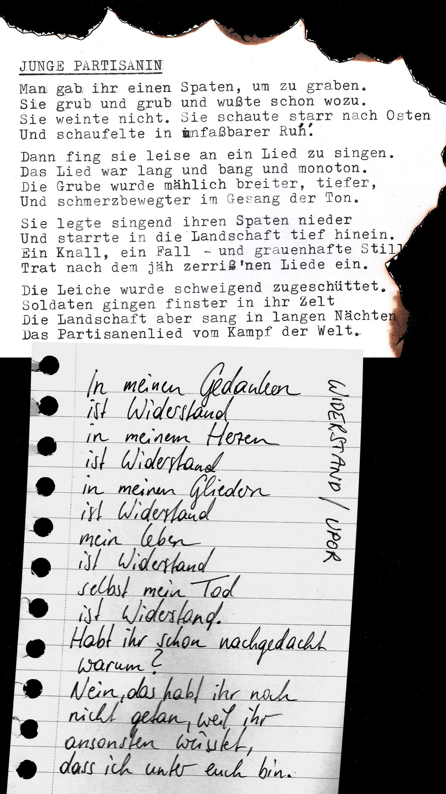 »Shtil, di nakht iz oysgeshtern« (Still, die Nacht ist voller Sterne) – die gesummte Melodie im Hintergrund – ist ein jiddisches Lied, das im Sommer 1942 von Hirsh Glick, einem jungen jüdischen Poeten und Partisanen, im Ghetto von Wilna nach einer russischen Volksmelodie geschrieben wurde. Er schrieb es aus Bewunderung für Vitka Kempner, die, kaum zwanzig, die erste geglückte Sabotageaktion gegen die deutsche Wehrmacht in Litauen verübte. Die Mitbegründerin der jüdischen Widerstandsorganisation ‚Fareynikte Partizaner Organizatsye‘ (FPO), einer Organisation jüdischer Partisan*innen aus dem Wilnaer Ghetto, sprengte nach einer 30 km langen Wanderung einen deutschen Militärzug, der Waffen an die Ostfront transportieren sollte, mit einer selbstgebauten Bombe in die Luft.