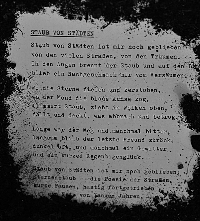 Die Urheberin des Gedichtes »Staub von Städten«, Anna Krommer, geboren am 31. März 1924 in Dolný Kubín (Tschechoslowakei), floh 1933 mit ihrer Familie nach Großbritannien. Von 1946 bis 1947 arbeitete sie als Briefzensorin für die US-amerikanische Militärbehörde in Offenbach. 1948 reiste sie nach Israel, seit September 1952 lebt sie in den Vereinigten Staaten. Sie veröffentlichte zahlreiche Gedichte, Erinnerungen, Reiseberichte und Essays.