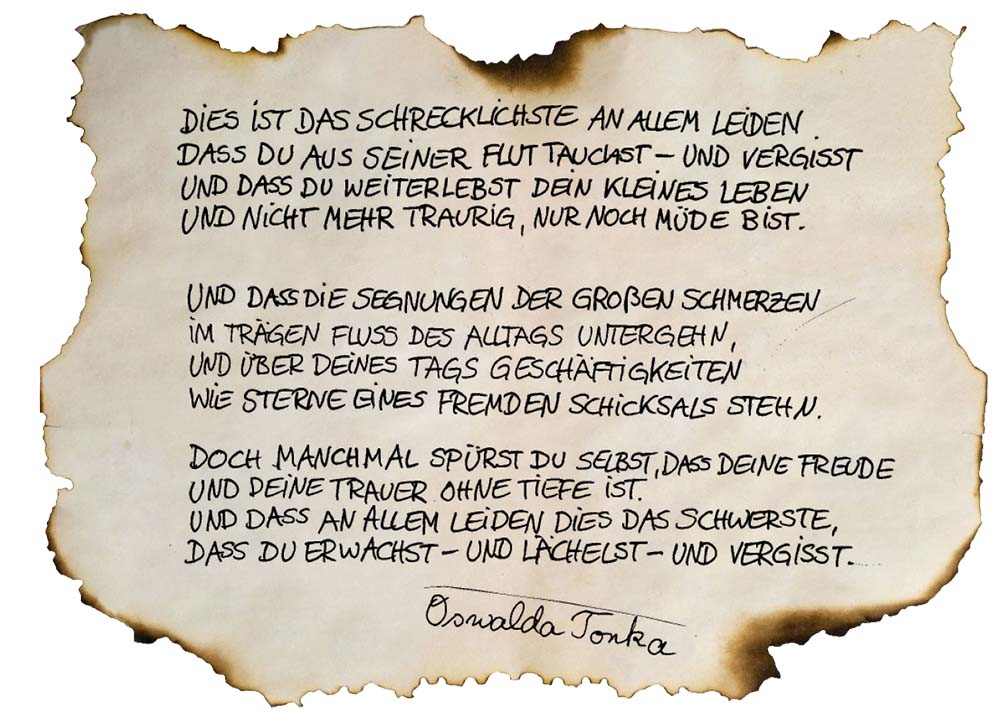 Wir haben aus Oswalda Tonkas Autobiographie »Buchengasse 100« das Gedicht »Das Schrecklichste« vertont, das sie 1944/1945 als 22-jährige schrieb.