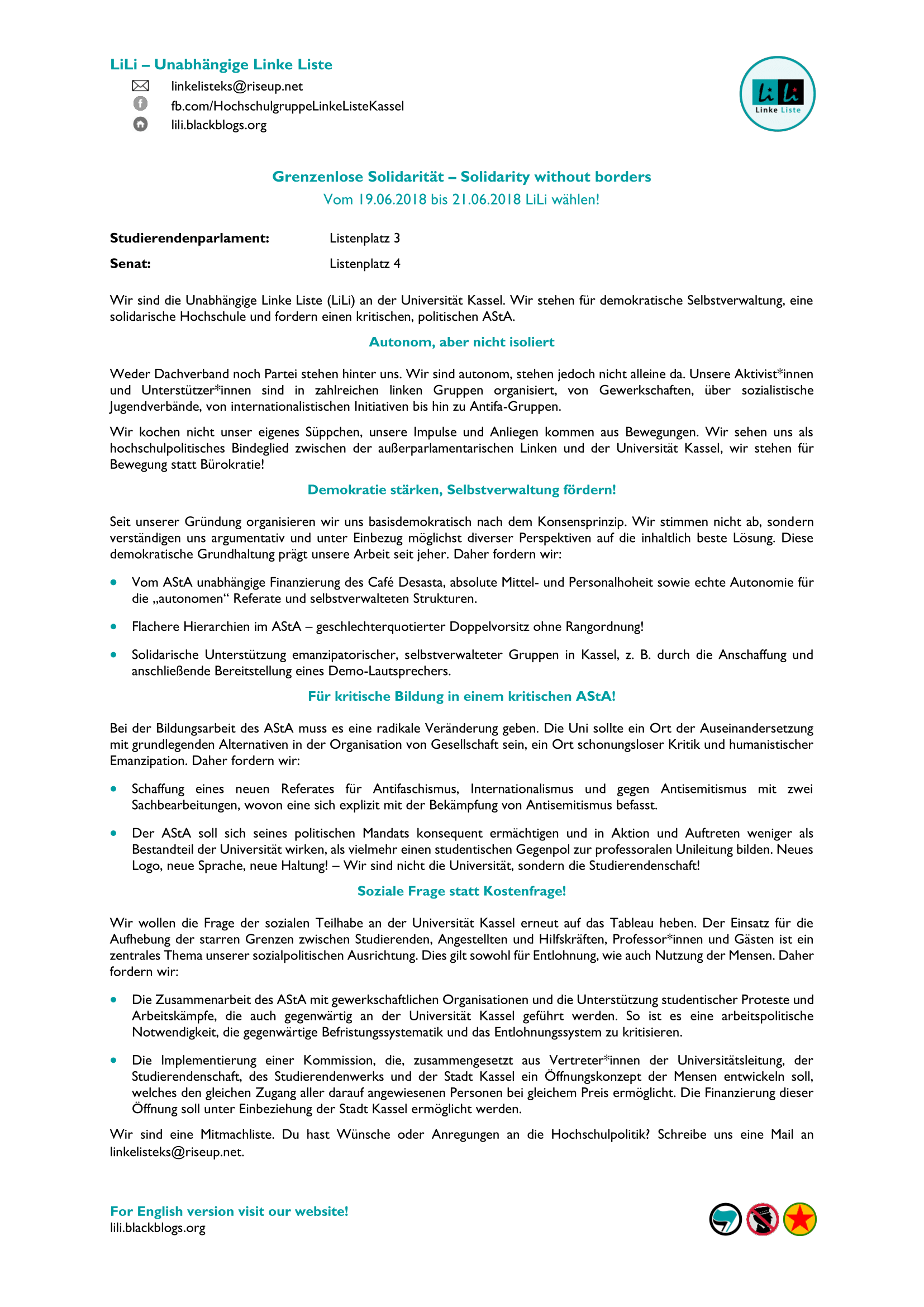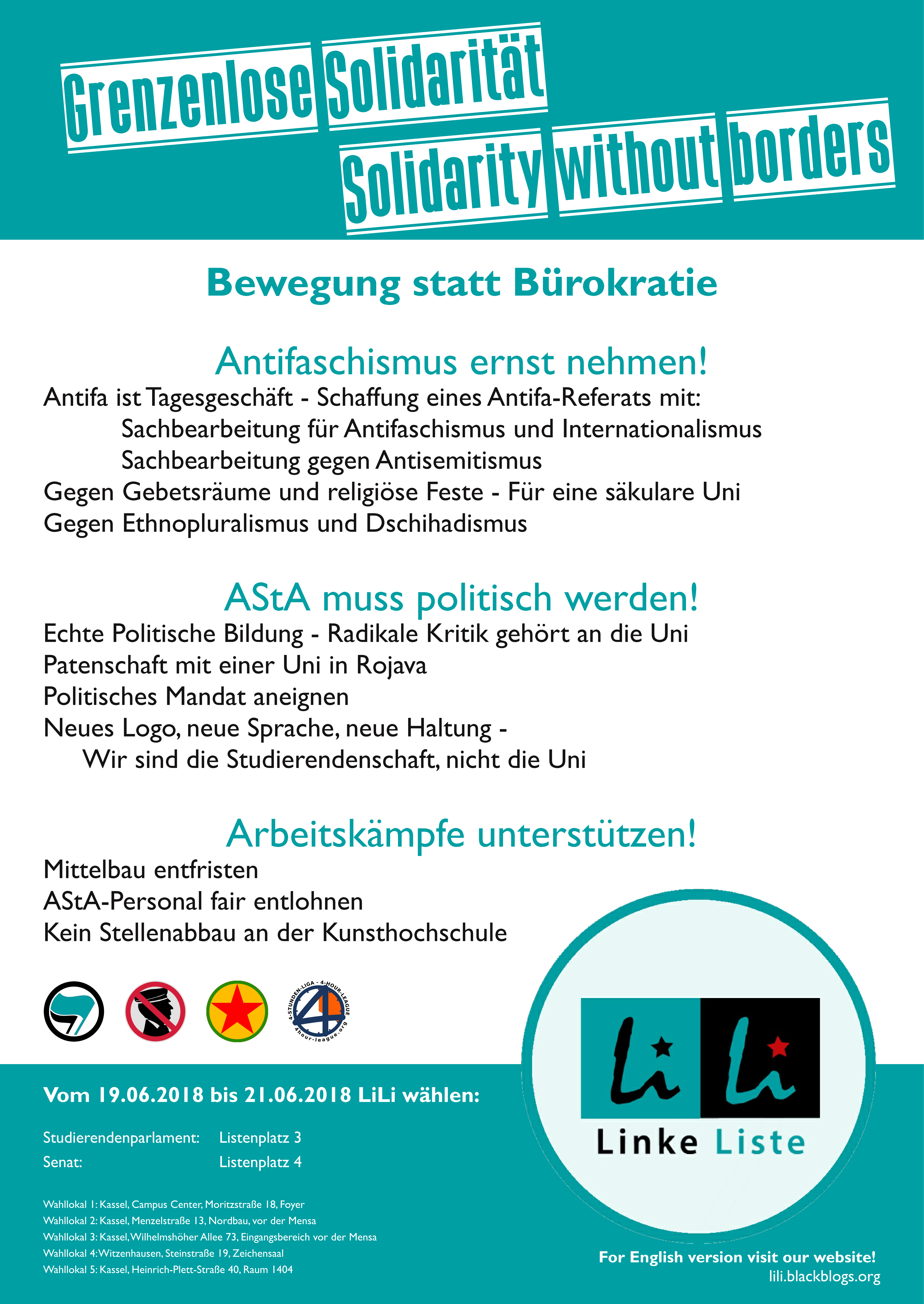Wir sind die Unabhängige Linke Liste (LiLi). Wir treten zu den Hochschulwahlen 2018 für das Studierendenparlament und den Senat an. Wir stehen für demokratische Selbstverwaltung, eine solidarische Hochschule und fordern einen kritischen, politischen AStA.
