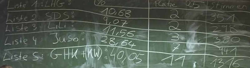 You may already have noticed that yesterday the ballots were counted. There was an unforeseen huge victory for the Green university group with 40.05 % of StuPa votes and 11 seats in parliament. From now on, the Green university group will be by far the strongest university group and will be strongly involved in the next General Students’ Committee.