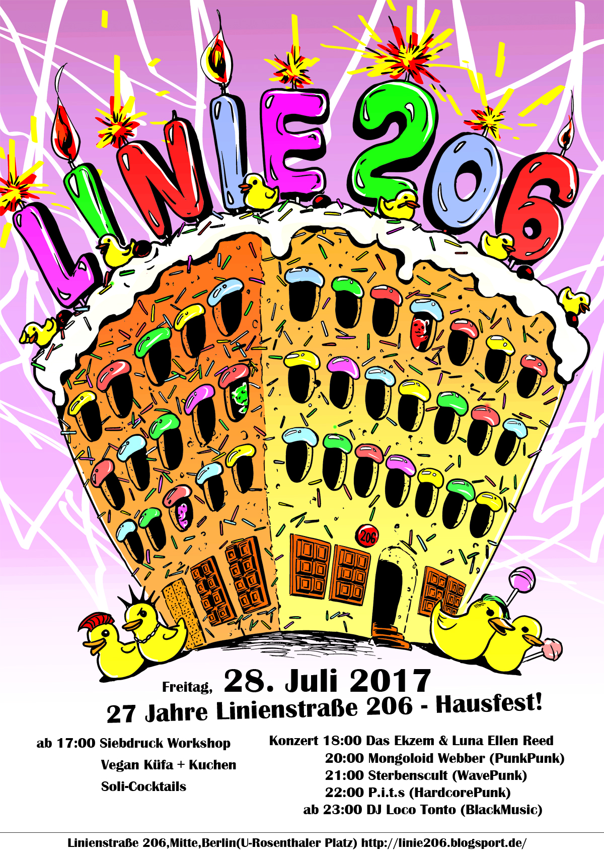On Saturday, August 14th, we will celebrate a party at the corner of Kleine Rosenthaler Straße and Linienstraße. There are many reasons to be angry in this world, but our resistance should also be celebrated once in a while. The 30th anniversary of the squatting of Linienstraße 206 wants to be celebrated. In recent years, the neighborhood has become more and more an anonymous quarter of the rich. Tenants and small businesses had to give way to private property flats, hip cafés and galleries. We do not want to accept this development. We are looking forward to coming together as neighbors, to get to know each other and to exchange ideas and perspectives. And of course we want to protest, celebrate and spend a nice day together.