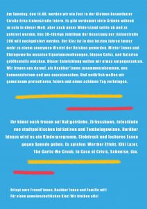 Ces dernières années, le quartier est devenu de plus en plus un quartier anonyme de riches. Les locataires et les petits commerces ont dû céder la place à des appartements en propriteté, des cafés branchés et des galeries. Nous voulons faire quelque chose contre cette évolution. Nous sommes impatients de nous retrouver entre voisins, d’apprendre à nous connaître et d’échanger des idées. Et bien sûr, nous voulons manifester, célébrer et passer une belle journée ensemble.