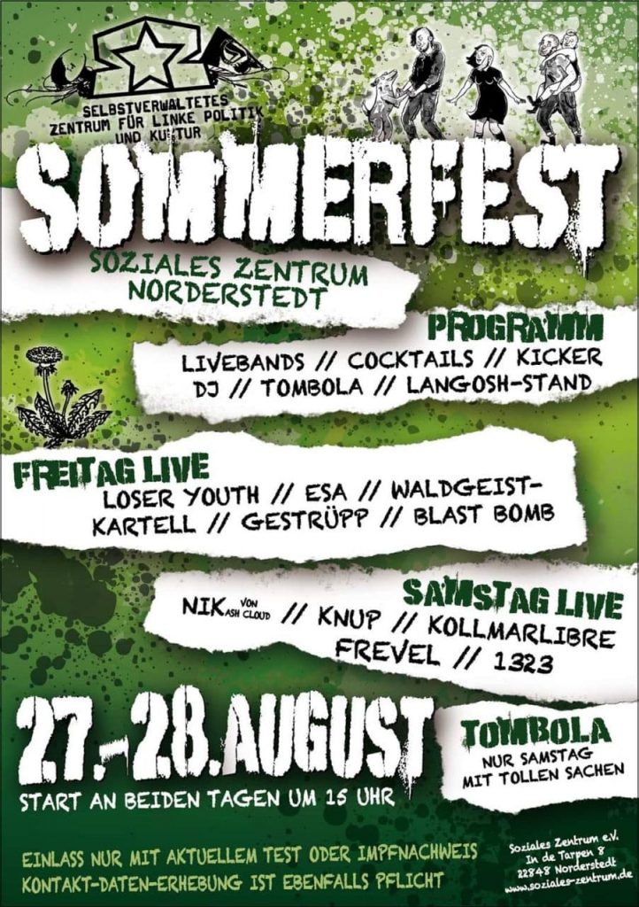 OMG! Dieses Wochenende gehts ab im Sozialen Zentrum Norderstedt, da ist Sommerfest mit Tombola, Langos, Halligalli und lauter feisten Bands! Wir haben die Ehre, den musikalischen Teil der Veranstaltung am Freitag um 17:00 zu eröffnen, also kommt rechtzeitig, sonst verpasst ihr uns. Lohnarbeit zählt nicht als Ausrede! 🥳