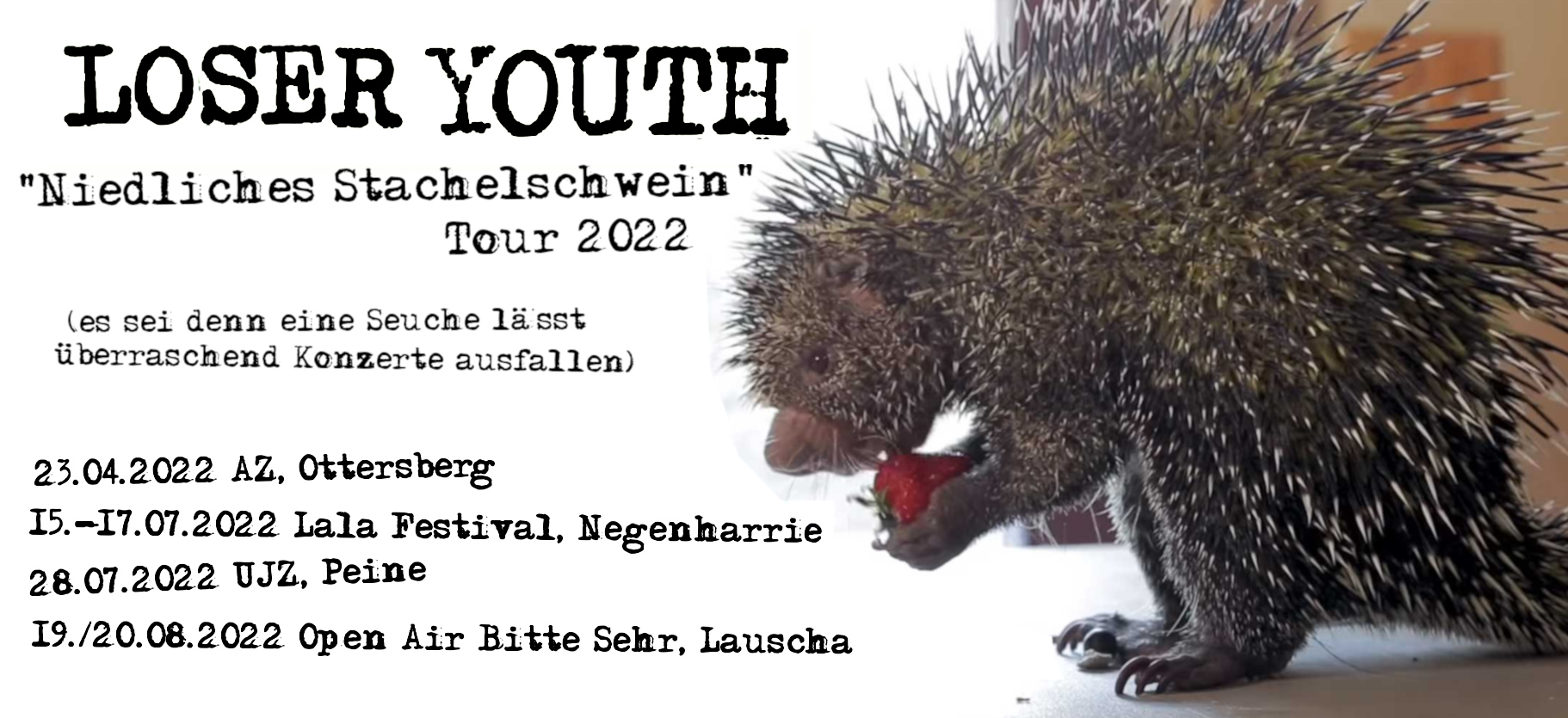 Okay, in Wirklichkeit ist das keine echte Tour, sondern einfach nur ein paar einzelne Konzerte, die dieses Jahr irgendwann hoffentlich stattfinden. Aber das Stacheltier reißts vielleicht ja raus. Wir ham auf jeden Fall Bock! <3