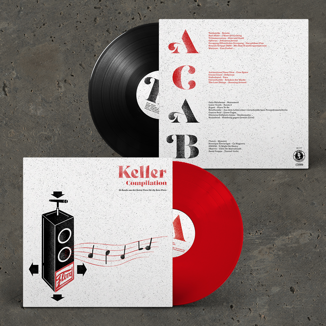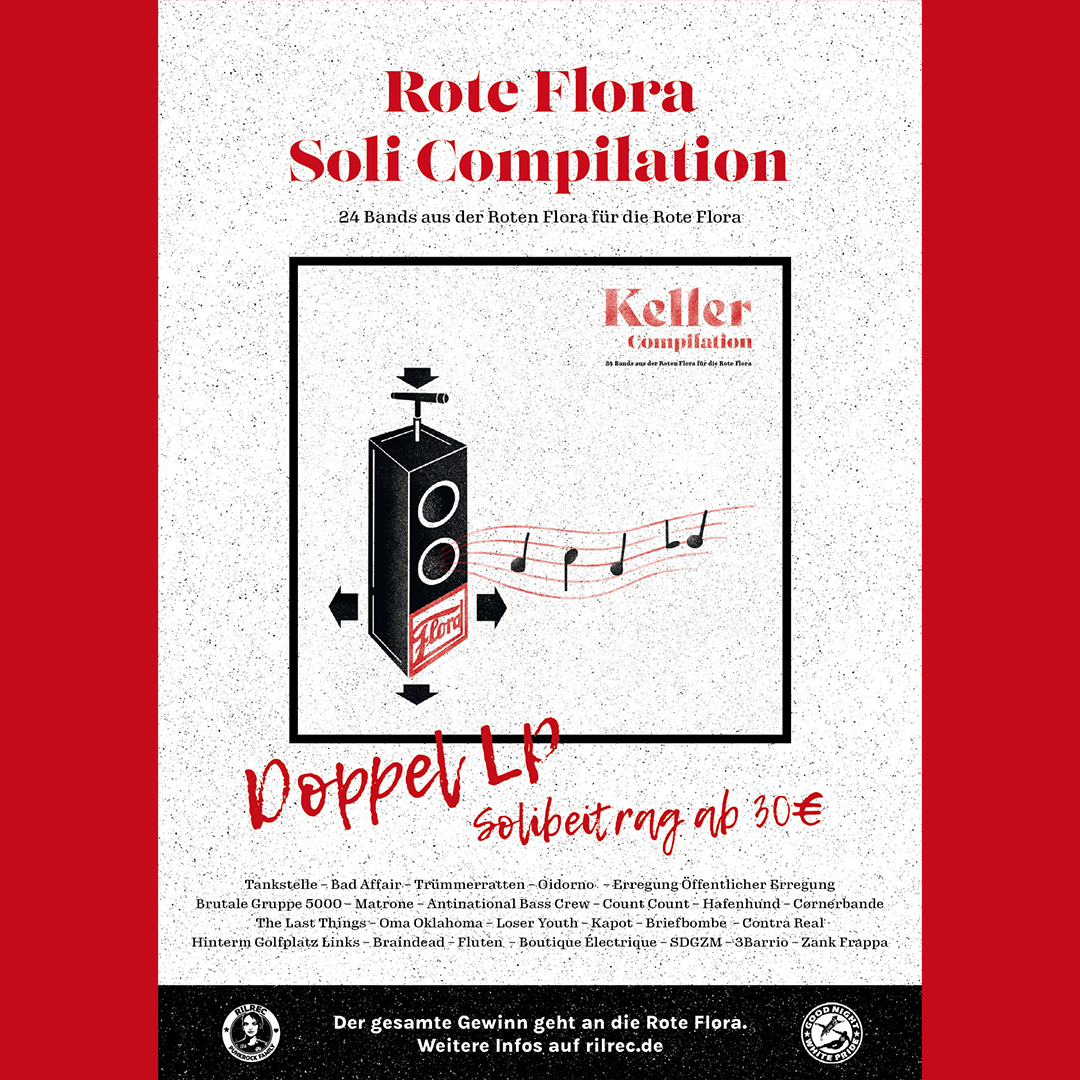 Das enorm geile RilRec hat einen Solisampler für unsere Lieblingshütte in Hamburg gebastelt. 24 Bands aus den Proberäumen der Roten Flora von Punk bis nicht-Punk. Viele unveröffentlichte Songs dabei, geiler Scheiß, heiß, heiß! Es handelt sich um eine Doppel LP (Rot und Schwarz), Gatefold, Insideout. Auflage 300. Solibeitrag ab 30 Ois.
