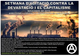 La setmana del 20 al 27 de setembre és sols una fita per l’ecologisme liberal i estatista, però per aquells que aspirem a la eliminació de l’estat, el capitalisme patriarcal i la seva ideologia classista, és una oportunitat per desbordar els estrets marges de la domesticació i iniciar una via autònoma, anticapitalista i anarquista contra la nocivitat tecnoindustrial.