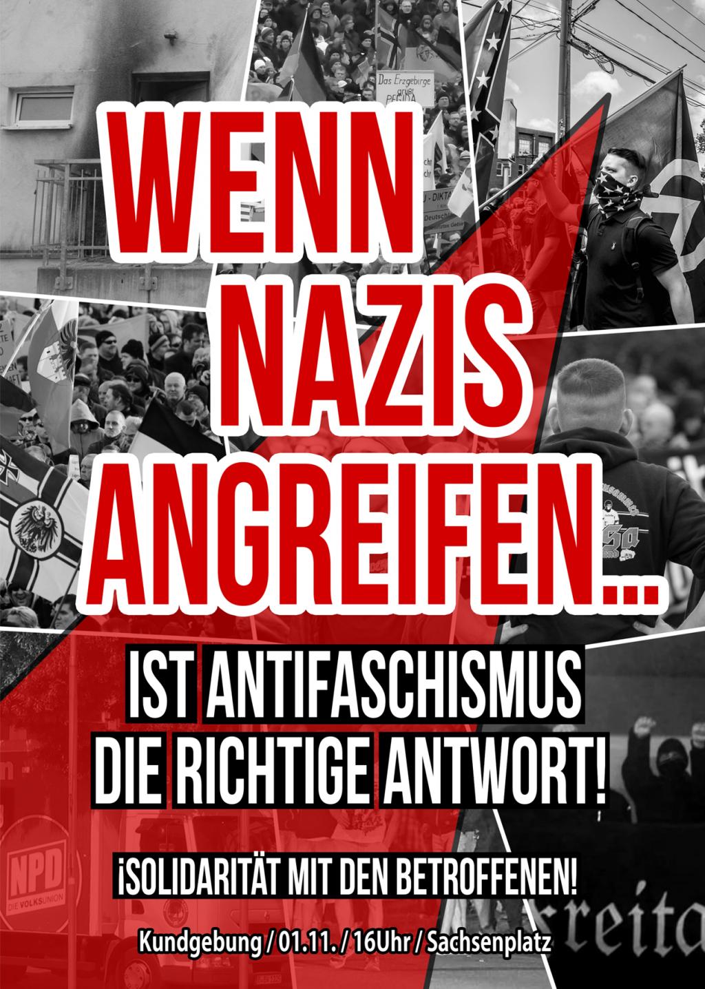 KüfA: 20:00 Uhr, Vortrag 21:00 Uhr – Die Soligruppe 01november stellt sich vor.   Dresden, 01. November 2012: Die NPD macht auf ihrer Brandstiftertour gegen “Asylmissbrauch und Islamisierung” mit zwei Kundgebungen in Dresden Station. An beiden Orten bleibt die NPD-Landtagsfraktion unter sich und wird von lautstarkem Gegenprotest übertönt. Damals...