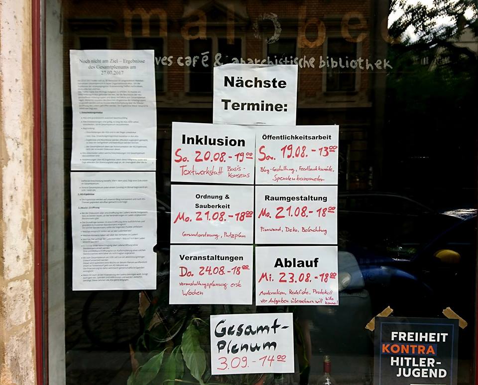 Nachdem das malobeo nun seit über mehr als einer Woche geschlossen ist, ist es Zeit, neue Ideen zu entwickeln. Lasst uns gemeinsam Perspektiven entwickeln, uns neu organisieren und einen politischen offenen Raum neu erschaffen. Wir wollen gemeinsam über basisdemokratische, dezentrale und offene Selbstorganisierung nachdenken und den Laden reorganisieren....