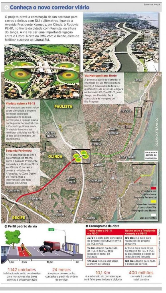 A falta de Estudos de Impacto Ambiental (EIA) pode suspender a continuidade das obras de construção da Via Metropolitana Norte, sistema viário que vai ligar a rodovia PE-15, em Olinda, até a PE-01, nas proximidades da ponte do Janga, em Paulista. Denúncias nas redes sociais motivaram a promotora de Justiça e Cidadania de Olinda, Belize Câmara, a recomendar a suspensão dos trabalhos na área imediatamente. A decisão de interromper o projeto estadual, orçado em R$ 123 milhões com recursos do Programa de Aceleração do Crescimento (PAC Mobilidade), foi publicada no Diário Oficial do Estado da última quarta.