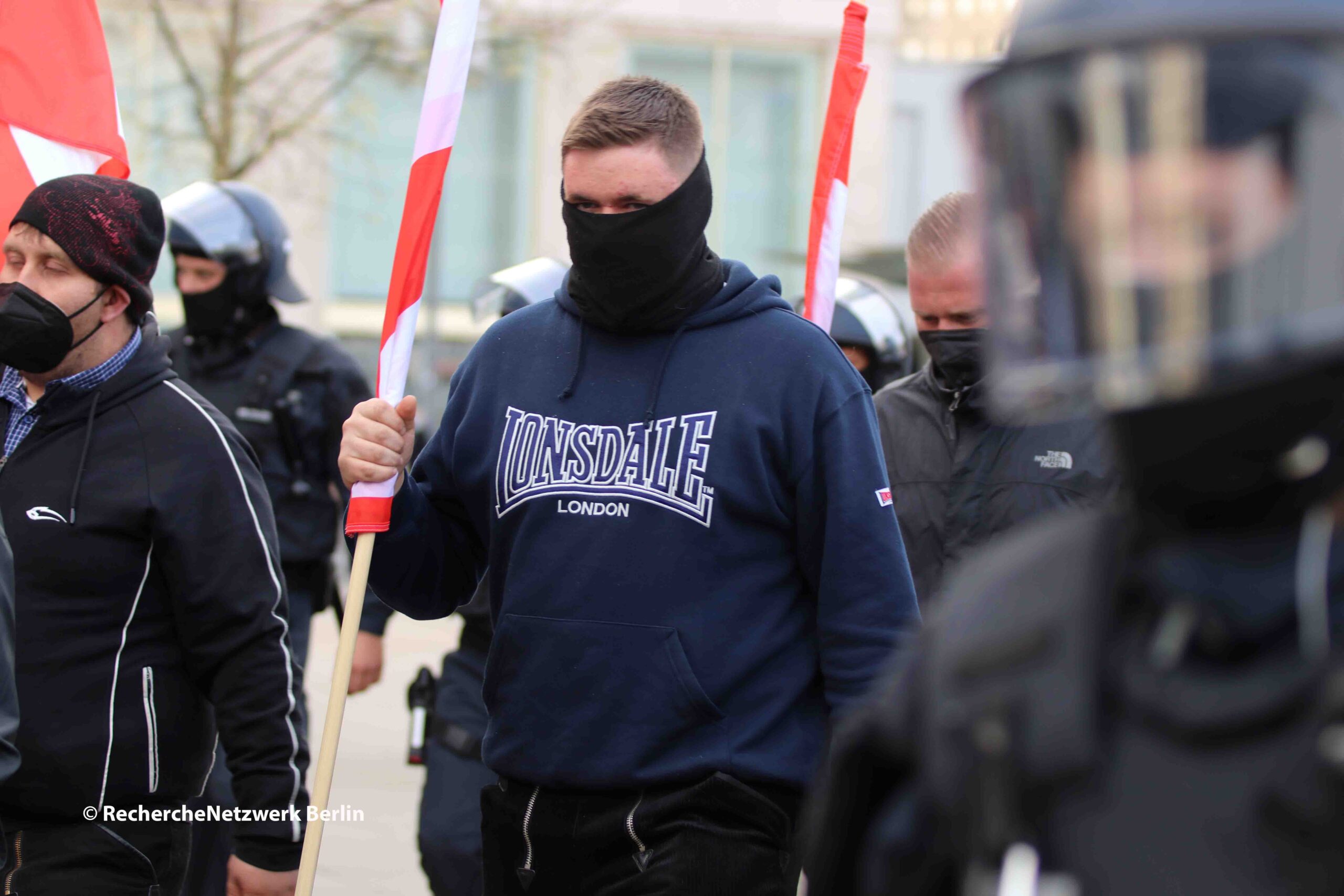 Ebenfalls bei der gestrigen Demonstration in Pankow war der Neonazi Larsen Aslan, der sich sowohl gestern als auch bei einer antifaschistischen Demonstration im Juli diesen Jahres in Hellersdorf als Anti-Antifa-Fotograf versuchte. Aslan, der wie Storch Fan des Berliner Fußballclubs (BFC) ist, hat bereits eine lange Vita in der Neonaziszene. Neben langjähriger Aktivität bei rassistischen Mobilisierungen in Marzahn-Hellersdorf fiel er ebenfalls durch überregionale Aktivitäten auf, wie dem Ordnungsdienst beim Heß-Aufmarsch 2018 in Berlin.