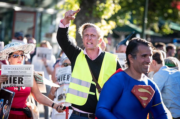 Um diese doch recht widersprüchlichen Positionen in einer gemeinsamen Protestbewegung zusammenführen zu können, bedarf es gerade für deren besonders unappetitliche Anhänger*innen eines zivilen und fortschrittlichen Anstriches. Der „Kommunikationsstelle Demokratischer Widerstand“ (KDW) kommt diese Funktion zu. Mit der Organisierung der ersten „Hygiene-Demos“ am Rosa-Luxemburg-Platz gab die KDW den Startschuss für die bundesweiten Corona-Querfront-Proteste und wirkte stilbildend für diese. Ob Stuttgart, Leipzig oder Berlin: Hippies, Esos, Nazis, AfD alle auf einer Demo.