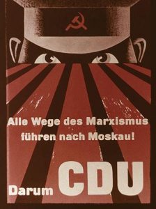 Nach der militärischen Zerschlagung des Nationalsozialismus wurden mit der neuen Blockkonfrontation antikommunistische Ideen wieder salonfähig. Hier wurde wieder plakativ mit den im Nationalsozialismus üblichen Tierdarstellungen und Entmenschlichungen in der politischen Auseinandersetzung mit dem Kommunismus operiert. Kommunistinnen wurden als Rattenfänger und Volksverführer dargestellt. »Alle Wege des Marxismus führen nach Moskau!« hieß es auf einem Wahlplakat der CDU aus dem Jahr 1953. Angesprochen und angegriffen zugleich war keineswegs nur die, schon damals fast bedeutungslose, KPD, sondern auch die SPD, die ähnlich wie im Sprachgebrauch der Nationalsozialisten als Teil oder zumindest Werkzeug eines bedrohlichen Marxismus verstanden wurde, der in Moskau beheimatet sein sollte. 1986 formulierte der Berliner Historiker und Faschismusforscher Ernst Nolte in mehreren Publikationen die umstrittene These von der Ursprünglichkeit des sowjetischen Gulags, und vermeintlichen Reflexibilität des nationalsozialistischen Konzentrationslagers, und löste einen Streit unter Historikerinnen aus. Hitler habe nach Nolte mit dem Holocaust nur auf die wahrgenommene jüdisch-bolschewistische Bedrohung reagiert, sei ihm „insoweit ein gewisses historisches Recht zuzuschreiben, als er sich dem umfassenden Anspruch der Sowjetunion mit großer, wenn auch vermutlich weit überschießender Energie widersetzte“. Noltes Thesen wurden von der überwiegenden Mehrheit der Geschichtswissenschaftler*innen mit der Begründung einer antisemitischen Entsorgung der deutschen Vergangenheit durch eine Täter-Opfer-Umkehr abgelehnt. Am 5. Mai 1999 reichte Hohmann, damaliger CDU und heutiger AfD-Bundestagsabgeordnete, einen Antrag ein, der die Errichtung eines Holocaust-Mahnmals ablehnen sollte. Am 25. Juni begründete Hohmann diesen Antrag in einer geschichtsrevisionistischen Rede. Das Holocaust-Mahnmal sei in seinen Augen ein Indiz dafür, dass die Deutschen sich ihre Vergangenheit nicht verzeihen könnten. Zitat Homann: „Meine Damen und Herren, viele Menschen fordern uns als Deutsche auf, langsam den Mut zu fassen, unseren Freunden zu sagen: Mehr als zwei Generationen nach diesem riesigen Verbrechen fühlen wir uns sozusagen resozialisiert. Warum? Kein Land hat Verbrechen in seiner Geschichte aufgearbeitet und bereut, Entschädigung und Wiedergutmachung geleistet wie wir. Nach christlichen Maßstäben folgt auf Sünde, Reue und Wiedergutmachung das Verzeihen. Freilich, das Verzeihen kann man nicht erzwingen. Aber von Freunden darf man es erwarten. Fast drei Generationen Bußzeit bis heute. Es sollten nicht sechs oder sieben werden. Insofern wäre das Mahnmal auch monumentaler Ausdruck der Unfähigkeit, uns selbst zu verzeihen.“ Aufgrund seiner antisemitischen Rede wurde er im Jahre 2004 auch aus der CDU ausgeschlossen.