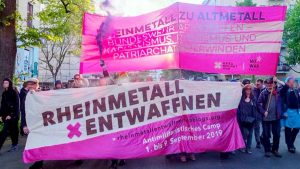 Aus unserer eigenen Erfahrung als Gruppe wissen wir selbst, dass es nicht immer einfach ist neben dem laufenden Alltagsbetrieb im Bereich Antifaschismus noch andere Themenfelder wirklich dauerhaft zu bespielen, ohne wieder andere Projekte auf Eis legen zu müssen. Das ganze ist darum nicht unbedingt eine Frage von Desinteresse, sondern vor allem eine der Organisation. Es bedarf darum Gruppen, die in der Lage sind langfristig an unterschiedlichen politischen Kampffeldern dran zu bleiben, die auch beim “Aufploppen” gesellschaftlicher Ereignisse in der Lage sind zu reagieren. Dies setzt wiederum voraus, dass unsere Strukturen thematische Arbeitsgruppen bilden, die politische Kontakte aufbauen und halten, sowie Analysen und Aktionsfähigkeit entwickeln. Alternativ oder auch zusätzlich dazu müssen Bündnisse aufgebaut werden, die konstant an Themen arbeiten. Im Bereich Antimilitarismus stimmen Kampagnen wie beispielsweise “Rheinmetall entwaffnen” sehr zuversichtlich.