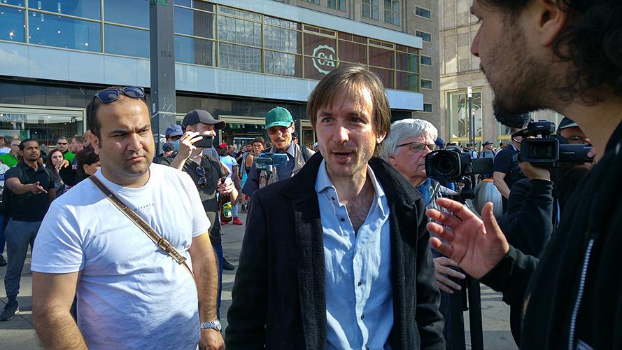 Eine ernstzunehmende Abgrenzung nach rechts gab es bei den, von der „Kommunikationsstelle Demokratischer Widerstand“ ins Leben gerufenen, sogenannten Hygiene-Demos nie. Das Gegenteil war immer der Fall. Rechte und extrem Rechte aller Couleur fühlten sich auf den Hygienedemonstrationen wohl und willkommen. Kein Wunder, sprachen doch die Veranstalterinnen, allen voran Anselm Lenz, vom ersten Tag an und mit wachsender Begeisterung vor allem mit rechten Bloggerinnen, rechten YouTube-Kanälen und rechten Journalistinnen. Dort hatten sie ihr Klatsch-Publikum gefunden, dort hörte man ihnen begeistert zu, und dort gab es auch all die anstrengende Kritik nicht, die ihnen von manch „etabliertem“ Medium entgegengebracht wurde. Aber eine Abgrenzung von rechten Positionen und Akteuren war von Lenz, Sodenkamp und Co. auch nie gewollt. Der späte und halbherzige Versuch einer Abgrenzung von einem einzelnen, extrem rechten Youtuber, war genauso erzwungen wie folgenlos. Als bereits klar war, dass zur Hygiene-Demo am 25.04.2020 neben Stefan Bauer, dem „Compact-Magazin“ und dem verurteilten Holocaustleugner Nikolai Nerling auch NPD, Identitäre und AfD auf dem Rosa-Luxemburg-Platz erschienen waren, bezeichneten Hendrik Sodenkamp und Anselm Lenz in einem Video die Teilnehmerinnen genau dieser Demonstration als „Querschnitt der tollsten Leute aus ganz Berlin“. Klarer und positiver kann man sich zu Rechten und Neonazis nicht positionieren, und diese verstanden die Einladung von Sodenkamp und Lenz sofort. Was folgte war so logisch wie absehbar. Innerhalb von nur zwei Wochen wuchs die Anzahl der bekannten Neonazis auf den Hygiene-Demos soweit an, dass es am 9. Mai schließlich auf dem angrenzenden Alexanderplatz zu rassistischen Übergriffen und zu Auseinandersetzungen mit der Polizei kam. Das massive Auftreten rechter Hooligans mit, inzwischen auch offen zur Schau gestellter, Nazisymbolik und die extrem aggressive Stimmung auf dem Alexanderplatz, führten an diesem Tag zu einer ersten direkten Konfrontation der „Kommunikationsstelle Demokratischer Widerstand“ mit ihrem so treuen wie deutschen Publikum. Hendrik Sodenkamp rief auf dem Alexanderplatz mehrfach „Nazis Raus“. Das Ergebnis war eine rasch anwachsende Traube an Hygiene-Demonstrant*innen, die ihn daraufhin lauthals als „Spalter“ beschimpften. „Jeder darf seine Meinung haben“ war wiederholt zu hören. Eine Parole, die in ihrer so einfachen, wie gefährlichen Fehlinterpretation von Einigkeit und Freiheit, beispielhaft dafür steht, wie fast jede rechte Querfronterzählung funktioniert.
