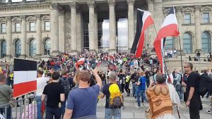 Die Demonstration am 1. August in Berlin stellt in der bisherigen Historie der sogenannten Corona-Proteste und ihrer offenen Radikalisierung nach rechts nur einen ersten, wenn auch wichtigen, kleinen Gipfel dar. Am 29. August durchbrachen Coronaleugner*innen, Verschwörungsgläubige und Neonazis die Polizeigitter vor dem Reichstag und stürmten, wie im Vorfeld angekündigt, ohne Gegenwehr der Berliner Polizei symbolisch die Stufen zum Reichstagsgebäude. In den vordersten Reihen waren auch an diesem Tag viele Personen wiederzufinden, die schon bei den frühen Protesten am Rosa-Luxemburg-Platz dabei waren. Neben dem Neonazi-Youtuber Nikolai Nerling, erlangte vor allem der rechtsradikale Youtuber und OCG-Mitglied Matthäus Westfal („Aktivist Mann“) durch seine Rolle auf der Reichstagstreppe bundesweit mediale Aufmerksamkeit. Vorausgegangen war dem sogenannten „Sturm auf den Reichstag“ am 29. August die „Mahnwache für Heimat- und Weltfrieden“ bei der vor allem Personen aus dem Reichsbürgerspektrum um staatenlos.info, gemeinsam mit bekannten Neonazis und ehemaligen Teilnehmer*innen des Berliner Querdenken-Camps, mehrere Wochen mit einer großen, professionellen Bühne direkt vor dem Reichstagsgebäude eine extrem rechte, verschwörungsideologische Dauermahnwache veranstalteten.