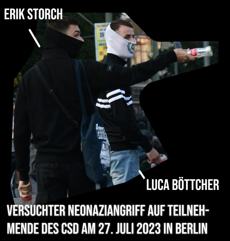 Mit Storch am versuchten Angriff beim CSD beteiligt war u.a. Luca Böttcher, der ebenfalls gestern durch die Bedrohung von Demonstrationsteilnehmer:innen auffiel. (Im Bericht zum CSD aufgeführt als Nummer 2, siehe https://kontrapolis.info/10917/)